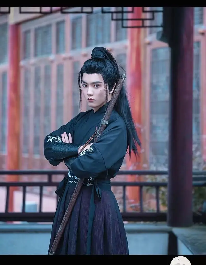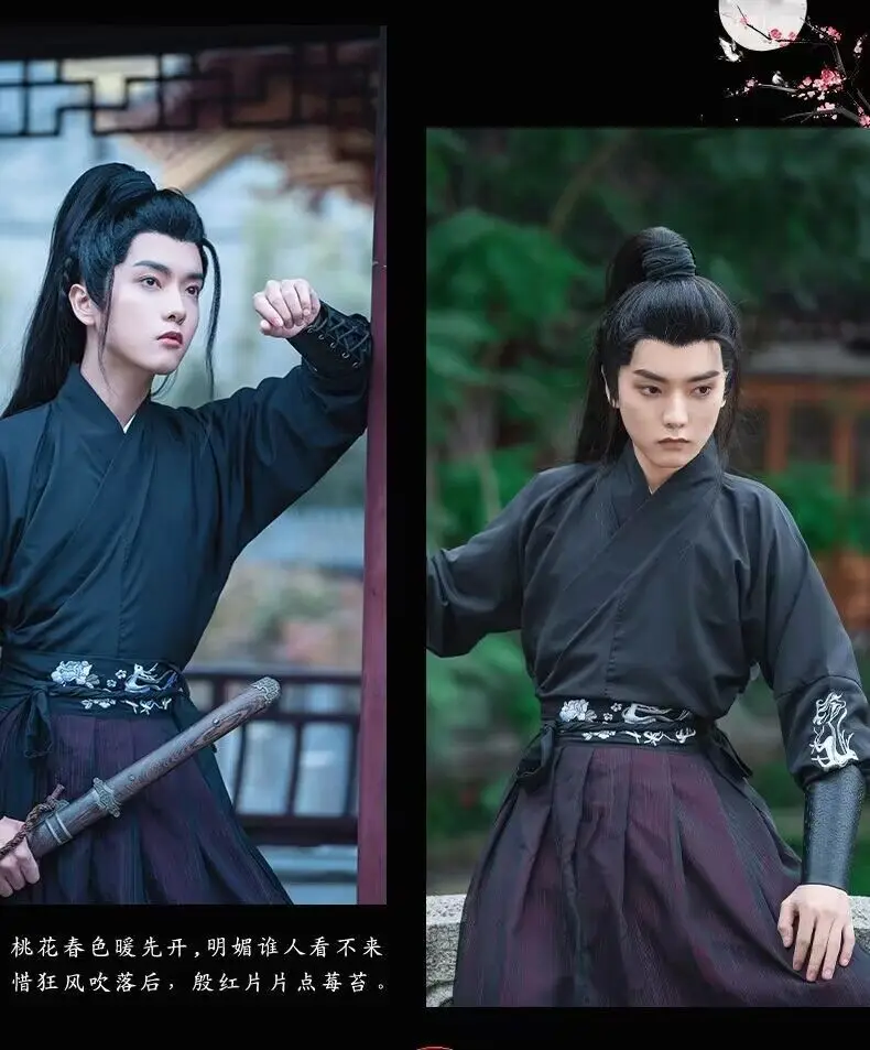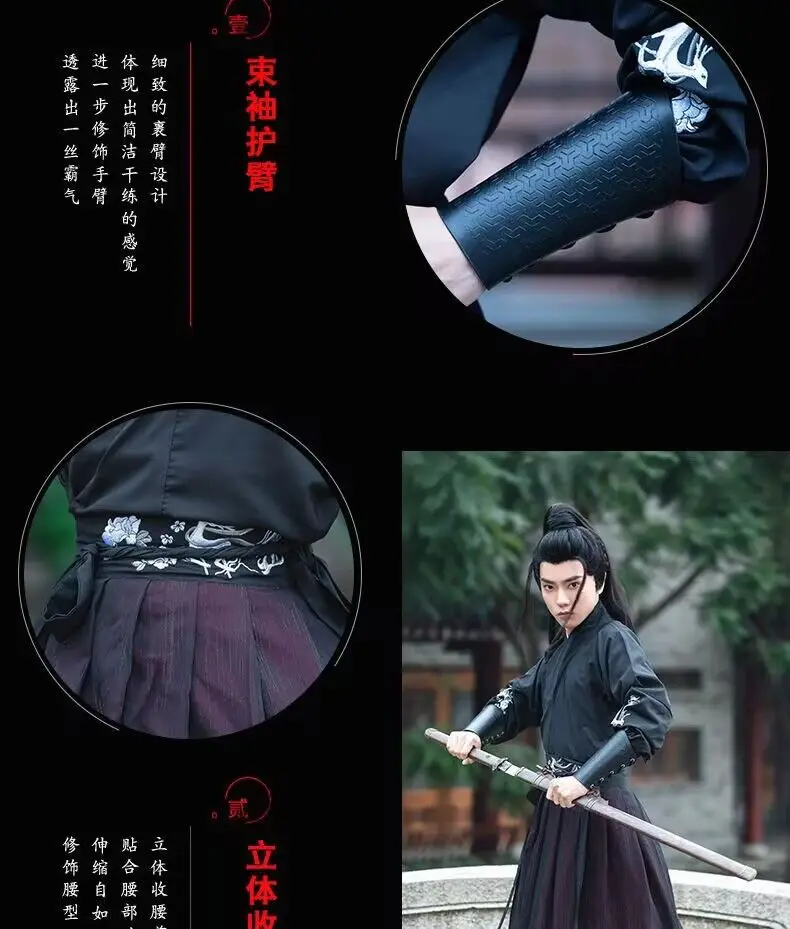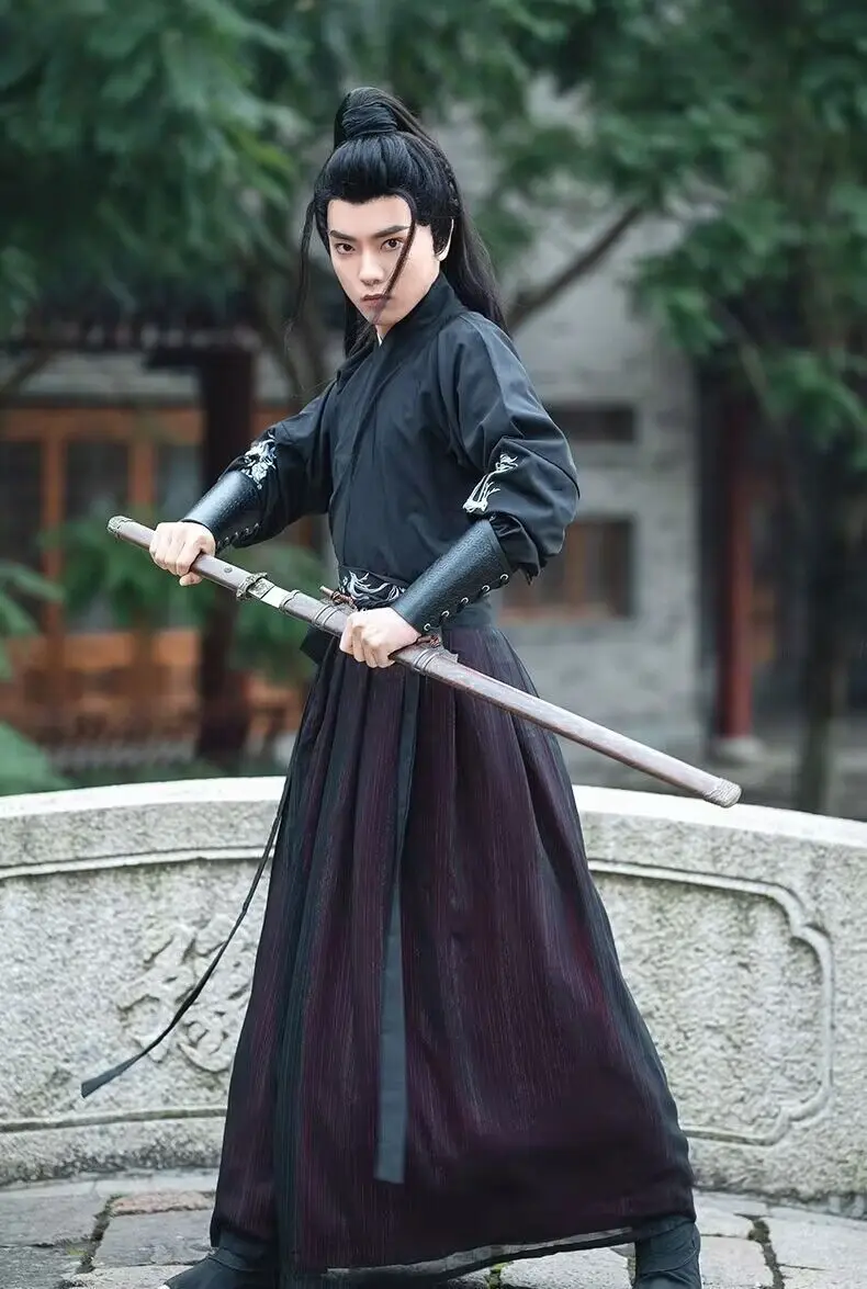 Large Size 4XL Hanfu Men Chinese Traditional Cosplay Costume Halloween Cos Costume Ancient Hanfu Black&Red Shirt+Skirt Sets
